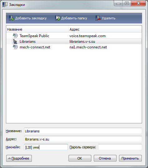 3. Добавляем в закладки сервер команды: